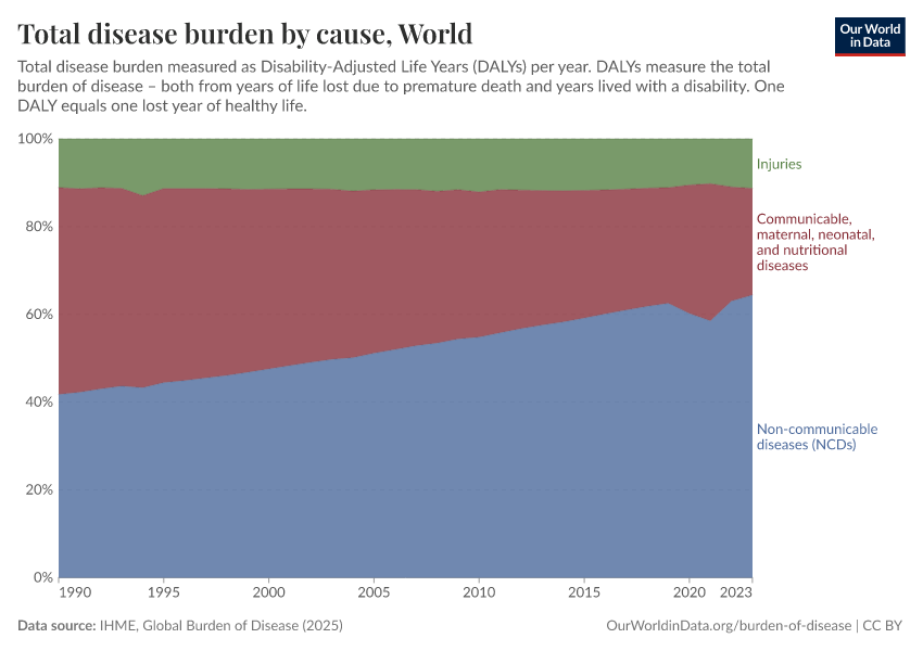 Epidemiologists break the disease burden down into three categories of disability or disease: non-communicable diseases (NCDs); communicable, maternal, neonatal, and nutritional diseases; and injuries. These are shown in the chart below.
