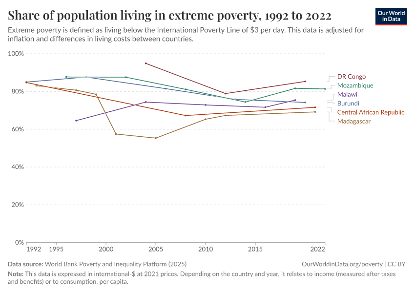 The situation is similar in other countries, as the chart below shows: in the Democratic Republic of Congo, Mozambique, Malawi, Burundi, and the Central African Republic, more than half of the population lives in extreme poverty. As their economies have stagnated, the deep poverty that most people live in has remained largely unchanged for decades.