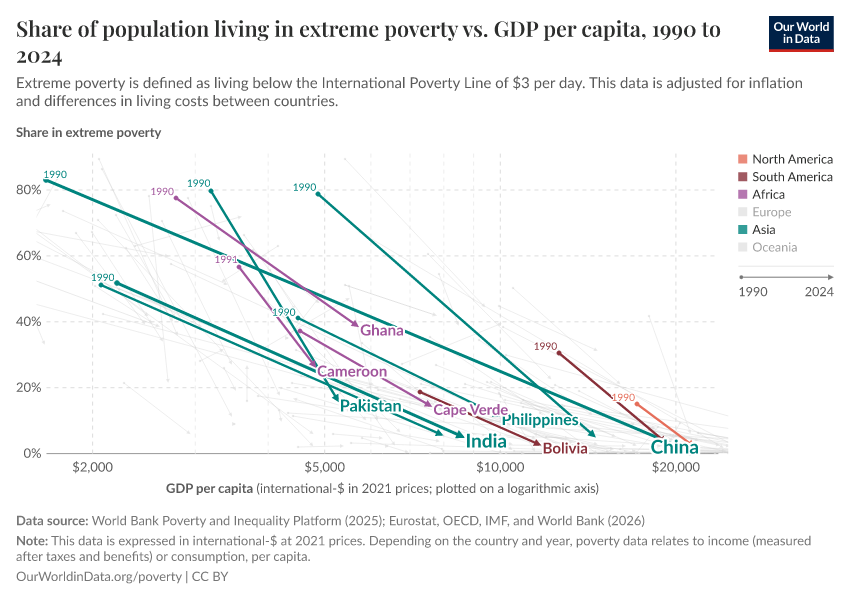 Extreme poverty declined in the last three decades because, back in the 1990s, the majority of the poorest people on the planet lived in countries that subsequently achieved very fast economic growth. In Indonesia and China, more than two-thirds of the population lived in extreme poverty. But these economies then grew rapidly, so that by today, the share has declined to less than 10%. Other large Asian countries — including India, Pakistan, Bangladesh, and the Philippines — also achieved strong growth, and as a consequence, the share living in extreme poverty declined rapidly. Much of the progress happened in Asia, but conditions in other regions improved too: the share living in extreme poverty also declined in Ghana, Cape Verde, Cameroon, Panama, Bolivia, Mexico, Brazil, and many other countries.