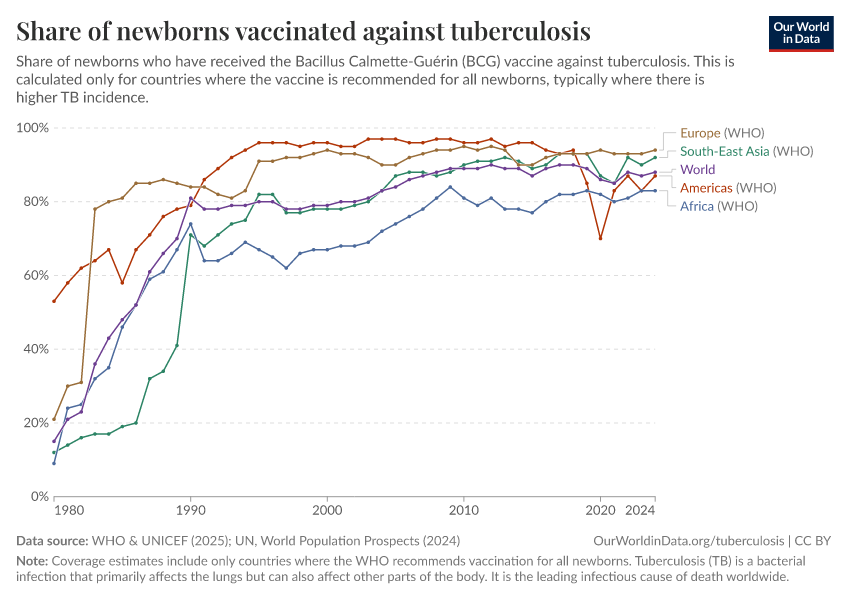 But many infants are still left behind: the global share of newborns vaccinated against TB has stagnated at around 88% for fifteen years.