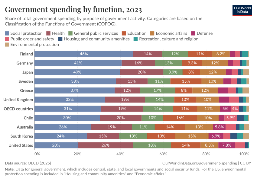 In the chart here we see the allocation of government spending (shown as a share of a country's GDP) across a range of “social spending” categories. Note that you can change which country is shown.