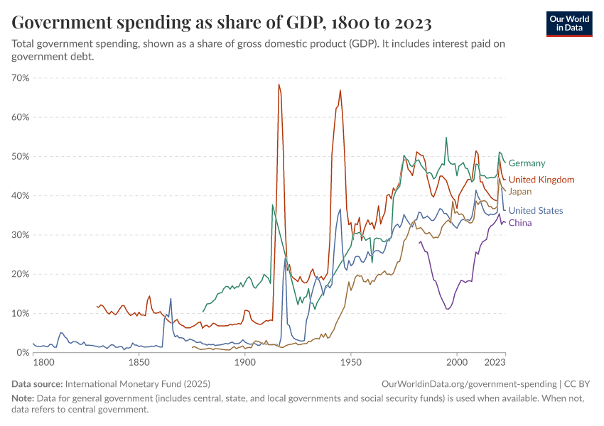 The visualization shows the evolution of government spending as a share of Gross Domestic Product (GDP), for a selection of countries over the last century.