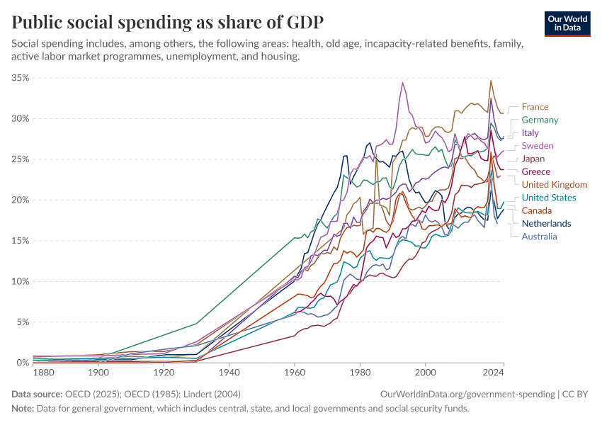 The chart above shows that government spending in early-industrialized countries grew substantially in the 20th century. The next visualization shows that this was the result of growth, specifically in social spending.
