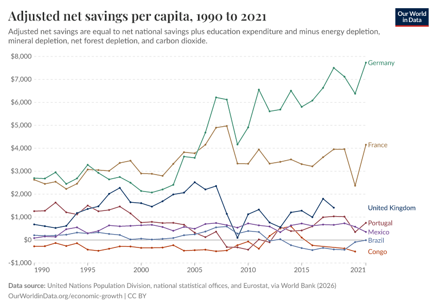 United Nations Population Division, national statistical offices, and Eurostat, via World Bank (2026) – processed by Our World in Data. “Adjusted net savings per capita” [dataset]. United Nations Population Division, national statistical offices, and Eurostat, via World Bank, “World Development Indicators 125” [original data]. Retrieved February 24, 2026 from https://categorical-map-color.owid.pages.dev/grapher/adjusted-net-savings-per-person