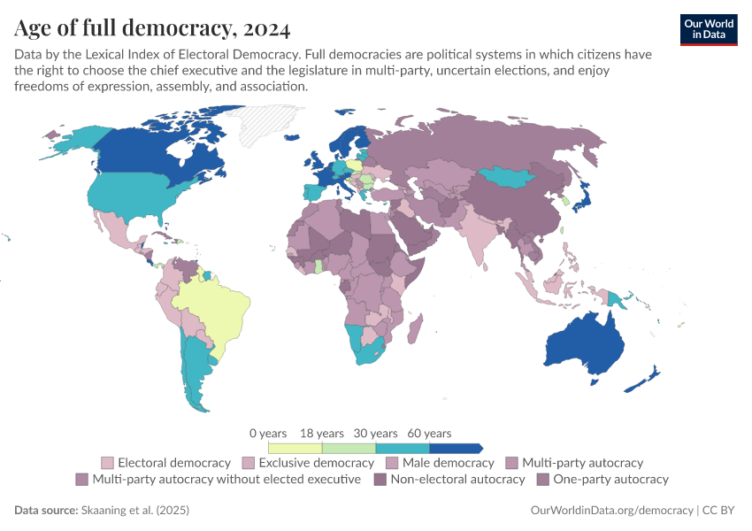 Skaaning et al. (2025) – processed by Our World in Data. “Age of full democracy” [dataset]. Skaaning et al., “Lexical Index of Electoral Democracy (LIED) v6.8” [original data]. Retrieved February 24, 2026 from https://categorical-map-color.owid.pages.dev/grapher/age-of-full-democracy