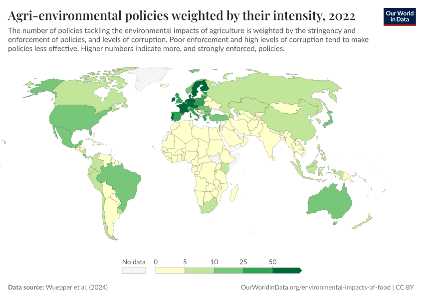 “Data Page: Agri-environmental policies weighted by their intensity”. Our World in Data (2026). Data adapted from Wuepper et al. (2024). Retrieved from https://categorical-map-color.owid.pages.dev/grapher/agri-environmental-policies-intensity [online resource]How to cite this data