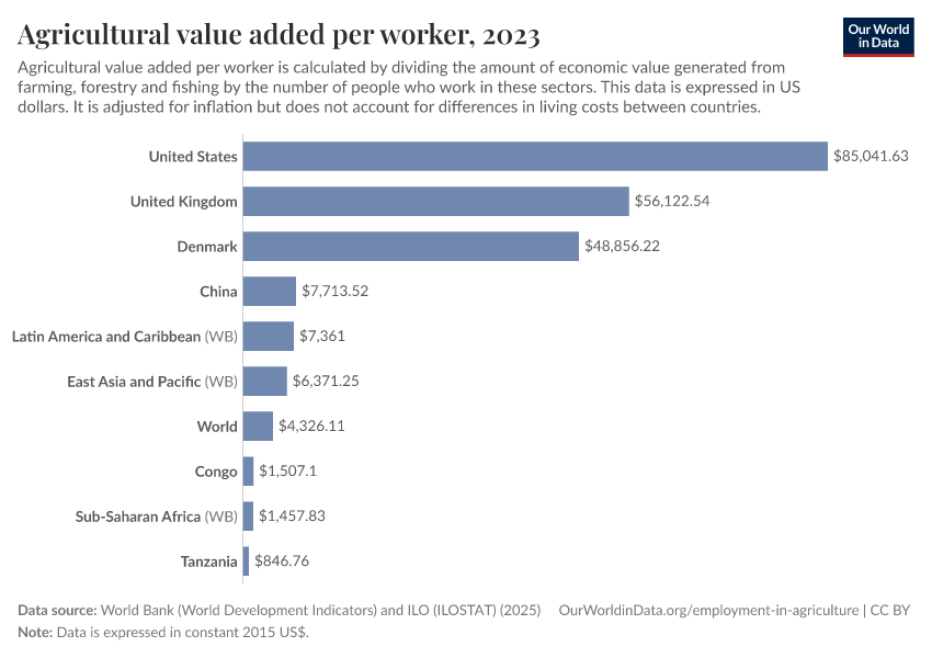 “Data Page: Agricultural value added per worker”. Our World in Data (2026). Data adapted from World Bank (World Development Indicators) and ILO (ILOSTAT). Retrieved from https://categorical-map-color.owid.pages.dev/grapher/agriculture-value-added-per-worker-wdi [online resource]