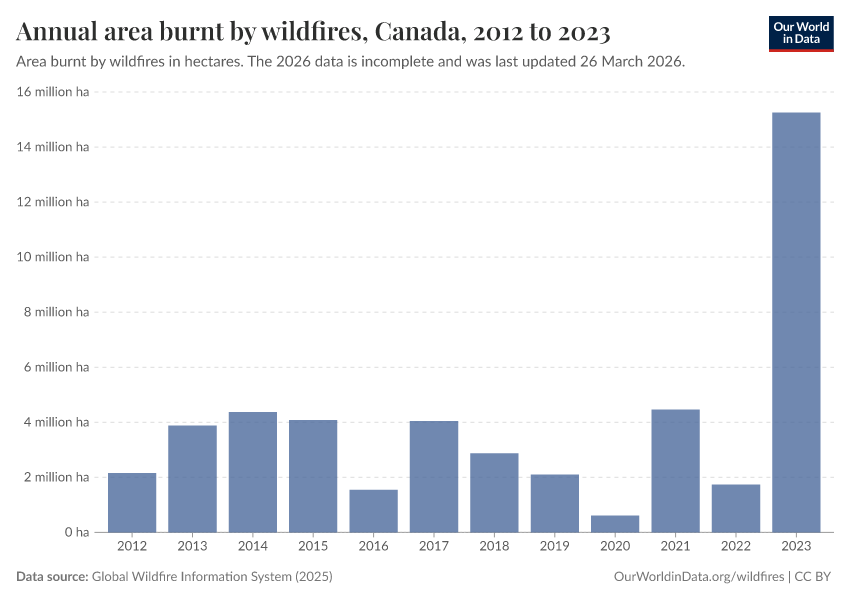 “Data Page: Annual area burnt by wildfires”, part of the following publication: Hannah Ritchie, Pablo Rosado, and Veronika Samborska (2024) - “Climate Change”. Data adapted from Global Wildfire Information System. Retrieved from https://categorical-map-color.owid.pages.dev/grapher/annual-area-burnt-by-wildfires [online resource]How to cite this data