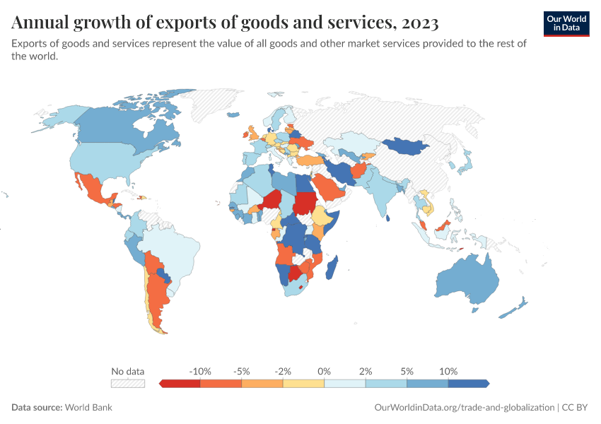 “Data Page: Annual growth of exports of goods and services”. Our World in Data (2026). Data adapted from World Bank. Retrieved from https://categorical-map-color.owid.pages.dev/grapher/annual-growth-of-exports-of-goods-and-services [online resource]How to cite this data