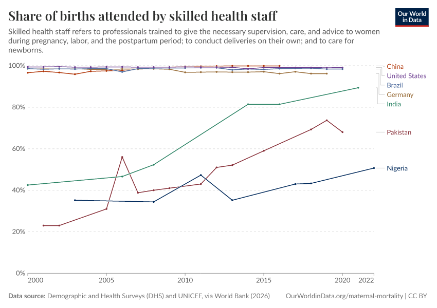 “Data Page: Share of births attended by skilled health staff”. Our World in Data (2026). Data adapted from Demographic and Health Surveys (DHS) and UNICEF, via World Bank. Retrieved from https://categorical-map-color.owid.pages.dev/grapher/births-attended-by-health-staff-sdgs [online resource]