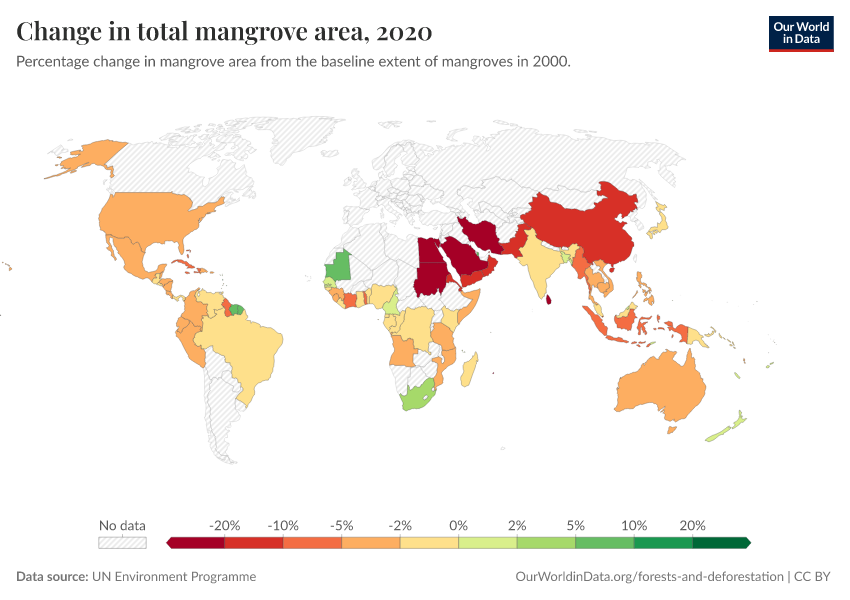 “Data Page: Change in total mangrove area”. Our World in Data (2026). Data adapted from UN Environment Programme. Retrieved from https://categorical-map-color.owid.pages.dev/grapher/change-in-total-mangrove-area [online resource]How to cite this data