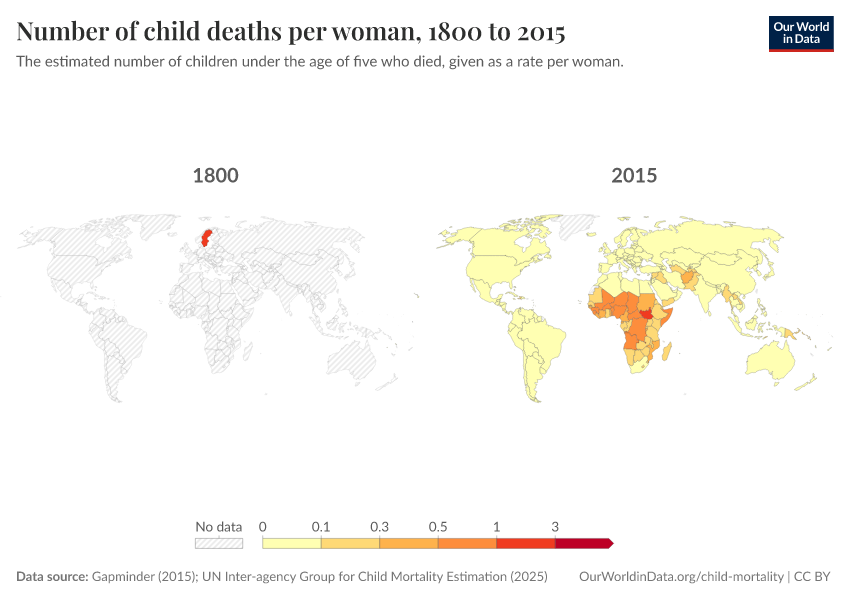 Gapminder (2015); UN Inter-agency Group for Child Mortality Estimation (2025) – processed by Our World in Data. “Child mortality rate – Gapminder; UN IGME – Long-run data” [dataset]. United Nations Inter-agency Group for Child Mortality Estimation, “United Nations Inter-agency Group for Child Mortality Estimation”; Gapminder, “Child mortality rate under age five v7”; Gapminder based on UN IGME & UN WPP, “Under-five Mortality v11”; United Nations, “World Population Prospects”; Gapminder, “Babies per woman (total fertility rate) v12”; Various sources, “Population” [original data]. Retrieved February 24, 2026 from https://categorical-map-color.owid.pages.dev/grapher/children-died-before-five-per-woman