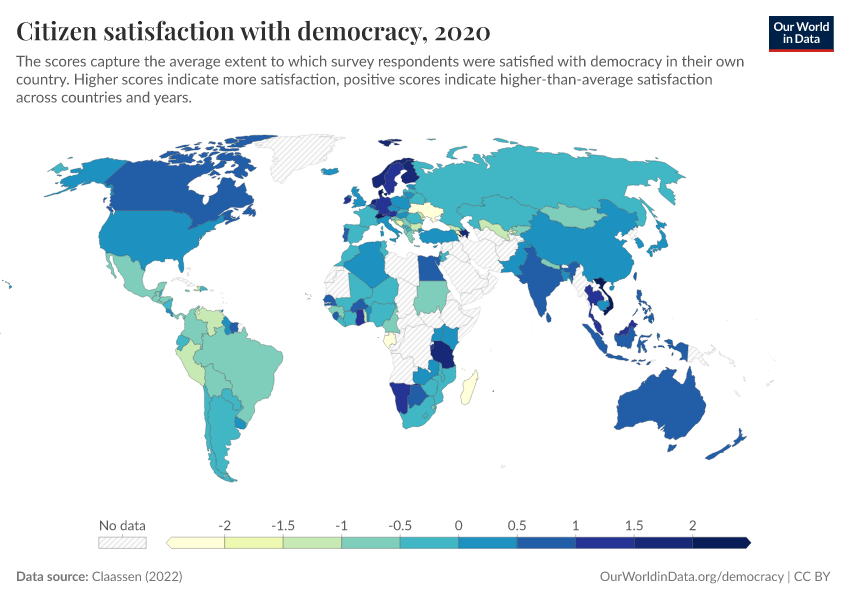 “Data Page: Citizen satisfaction with democracy”, part of the following publication: Bastian Herre, Lucas Rodés-Guirao, and Esteban Ortiz-Ospina (2013) - “Democracy”. Data adapted from Claassen. Retrieved from https://categorical-map-color.owid.pages.dev/grapher/citizen-satisfaction-with-democracy [online resource]How to cite this data