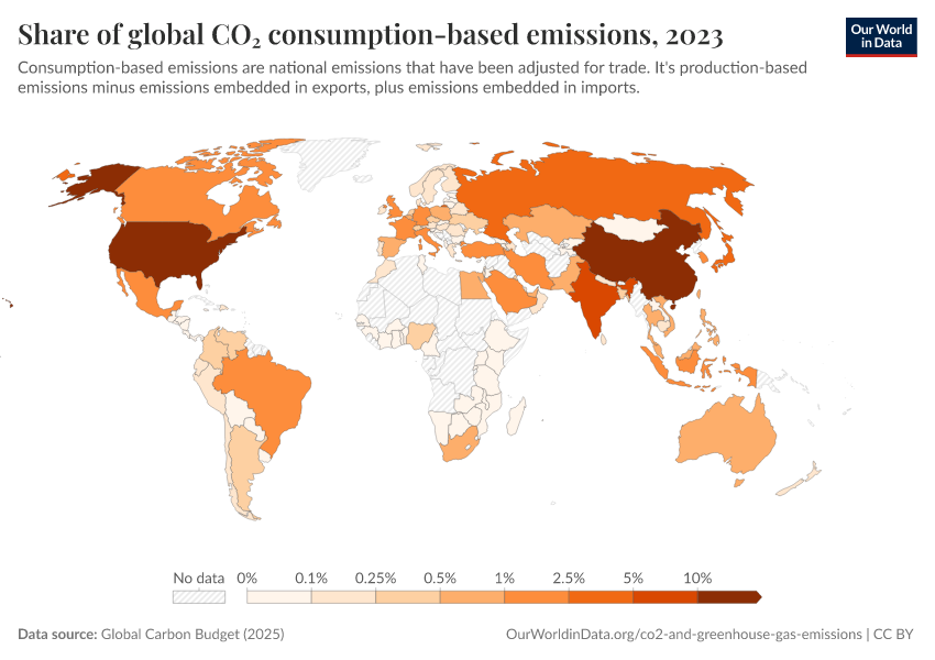 “Data Page: Share of global CO₂ consumption-based emissions”, part of the following publication: Hannah Ritchie, Pablo Rosado, and Max Roser (2023) - “CO₂ and Greenhouse Gas Emissions”. Data adapted from Global Carbon Project. Retrieved from https://categorical-map-color.owid.pages.dev/grapher/co2-consumption-share [online resource]How to cite this data