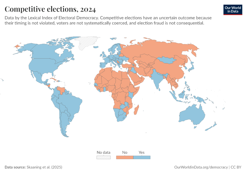 Skaaning et al. (2025) – processed by Our World in Data. “Competitive elections” [dataset]. Skaaning et al., “Lexical Index of Electoral Democracy (LIED) v6.8” [original data]. Retrieved February 24, 2026 from https://categorical-map-color.owid.pages.dev/grapher/competitive-elections-lexical