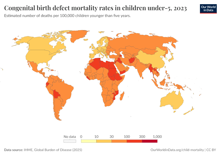 “Data Page: Congenital birth defect mortality rates in children under-5”, part of the following publication: Esteban Ortiz-Ospina and Max Roser (2016) - “Global Health”. Data adapted from IHME, Global Burden of Disease. Retrieved from https://categorical-map-color.owid.pages.dev/grapher/congenital-birth-defect-mortality-rates-in-children-under-5 [online resource]How to cite this data