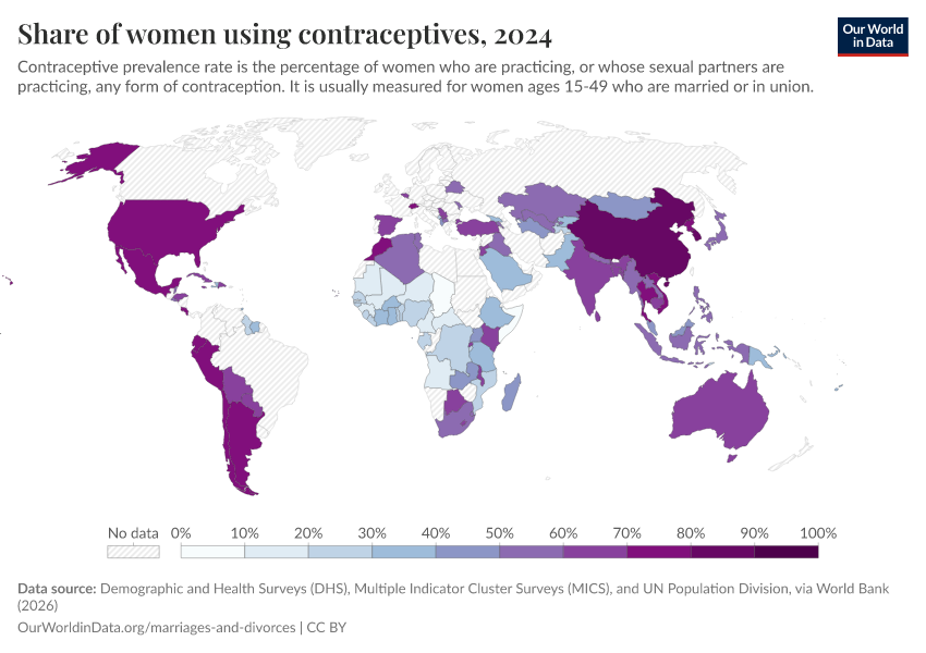 “Data Page: Share of women using contraceptives”. Our World in Data (2026). Data adapted from Demographic and Health Surveys (DHS), Multiple Indicator Cluster Surveys (MICS), and UN Population Division, via World Bank. Retrieved from https://categorical-map-color.owid.pages.dev/grapher/contraceptive-prevalence-any-methods-of-women-ages-15-49 [online resource]How to cite this data