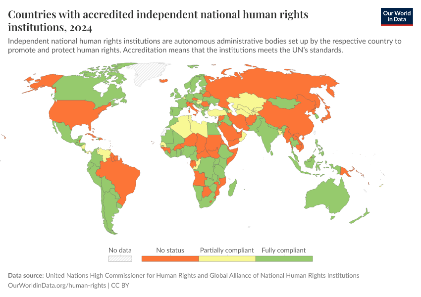 “Data Page: Countries with accredited independent national human rights institutions”. Our World in Data (2026). Data adapted from United Nations High Commissioner for Human Rights and Global Alliance of National Human Rights Institutions. Retrieved from https://categorical-map-color.owid.pages.dev/grapher/countries-with-independent-national-human-rights-institution [online resource]How to cite this data