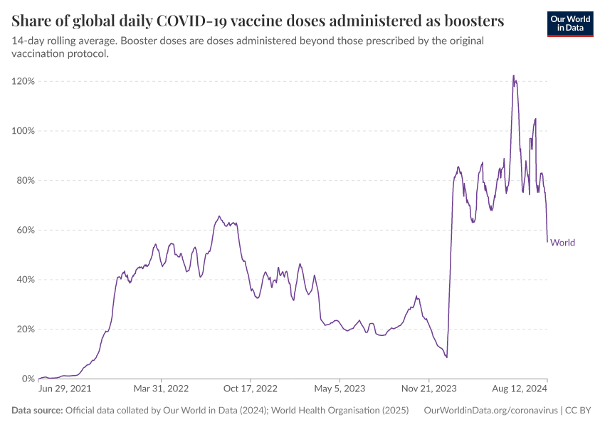 Official data collated by Our World in Data (2024); World Health Organisation (2025) – with major processing by Our World in Data. “Share of global daily COVID-19 vaccine doses administered as boosters” [dataset]. Official data collated by Our World in Data, “COVID-19, vaccinations”; World Health Organisation, “COVID-19, vaccinations (WHO)” [original data]. Retrieved February 24, 2026 from https://categorical-map-color.owid.pages.dev/grapher/covid-vaccine-share-boosters