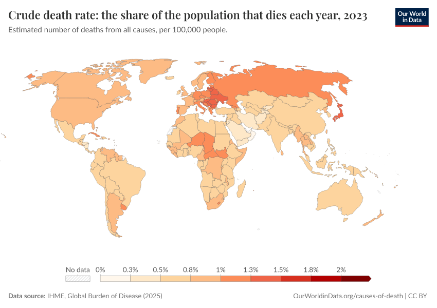 “Data Page: Crude death rate: the share of the population that dies each year”, part of the following publication: Esteban Ortiz-Ospina and Max Roser (2016) - “Global Health”. Data adapted from IHME, Global Burden of Disease. Retrieved from https://categorical-map-color.owid.pages.dev/grapher/crude-death-rate-the-share-of-the-population-that-dies-each-year-gbd [online resource]How to cite this data
