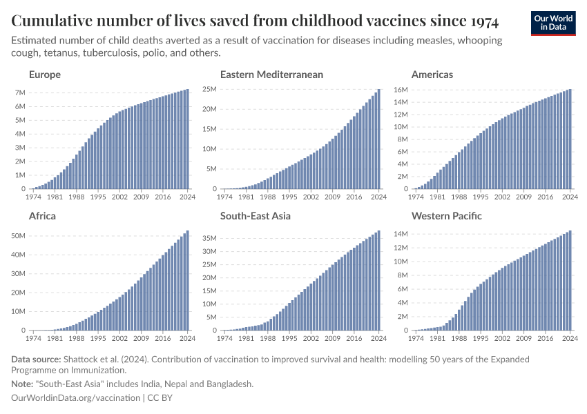 “Data Page: Cumulative number of lives saved from childhood vaccines since 1974”. Our World in Data (2026). Data adapted from Shattock et al. (2024). Contribution of vaccination to improved survival and health: modelling 50 years of the Expanded Programme on Immunization.. Retrieved from https://categorical-map-color.owid.pages.dev/grapher/cumulative-lives-saved-vaccination [online resource]How to cite this data