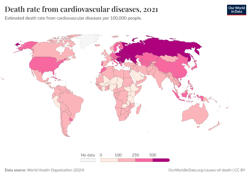 “Data Page: Death rate from cardiovascular diseases”, part of the following publication: Esteban Ortiz-Ospina and Max Roser (2016) - “Global Health”. Data adapted from World Health Organization. Retrieved from https://categorical-map-color.owid.pages.dev/grapher/death-rate-from-cardiovascular-disease-ghe [online resource]How to cite this data