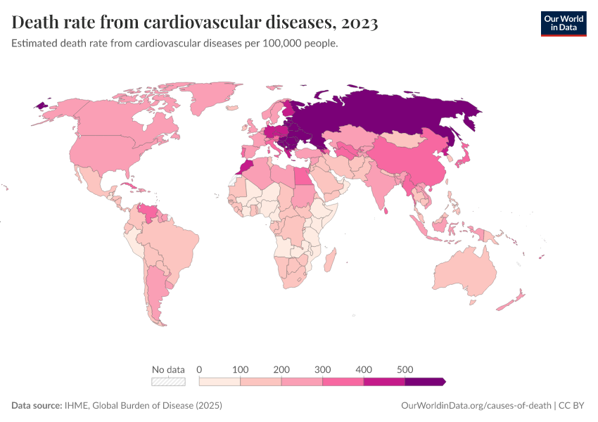 IHME, Global Burden of Disease (2025) – with major processing by Our World in Data. “Death rate from cardiovascular diseases” [dataset]. IHME, Global Burden of Disease, “Global Burden of Disease - Deaths” [original data]. Retrieved February 24, 2026 from https://categorical-map-color.owid.pages.dev/grapher/death-rate-from-cardiovascular-diseases