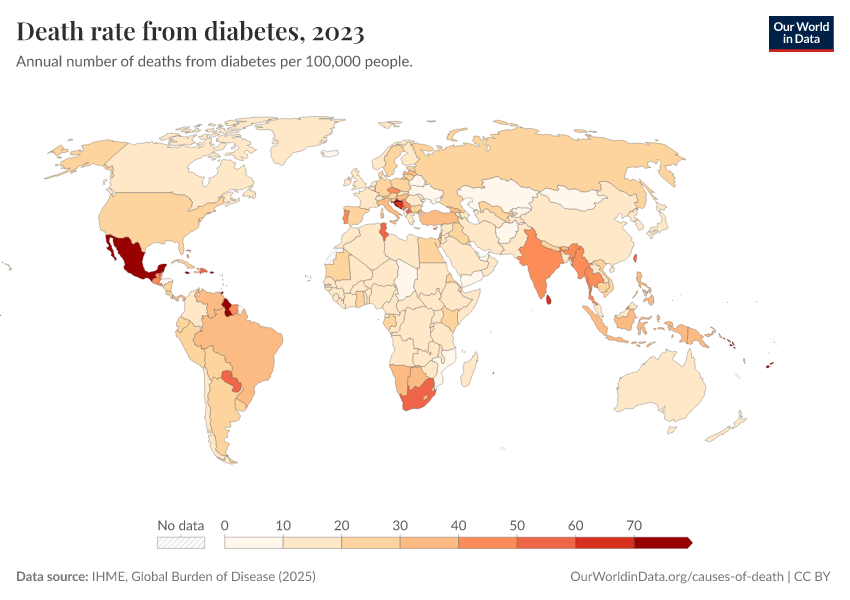 “Data Page: Death rate from diabetes”, part of the following publication: Esteban Ortiz-Ospina and Max Roser (2016) - “Global Health”. Data adapted from IHME, Global Burden of Disease. Retrieved from https://categorical-map-color.owid.pages.dev/grapher/death-rate-from-diabetes-gbd [online resource]How to cite this data