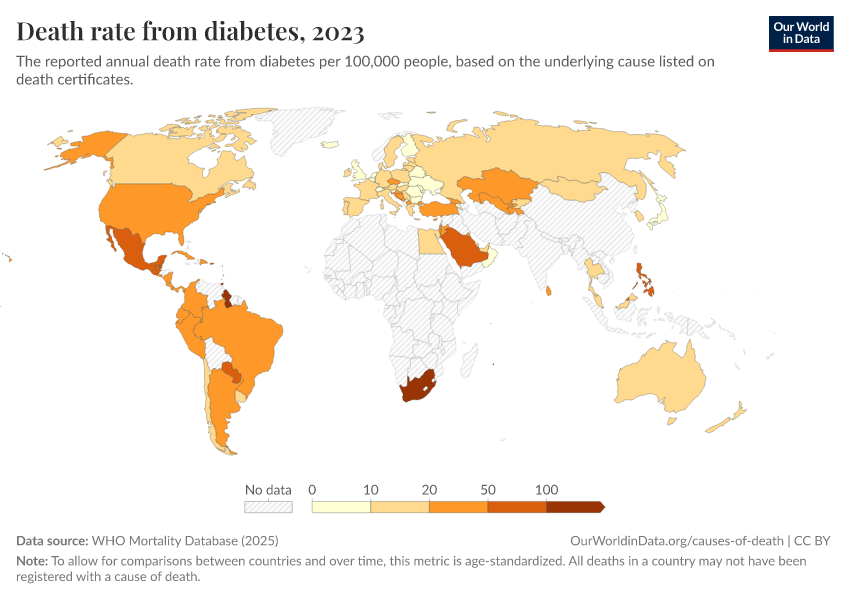 WHO Mortality Database (2025) – with minor processing by Our World in Data. “Death rate from diabetes” [dataset]. WHO Mortality Database, “WHO Mortality Database” [original data]. Retrieved February 24, 2026 from https://categorical-map-color.owid.pages.dev/grapher/death-rate-from-diabetes-who-mdb