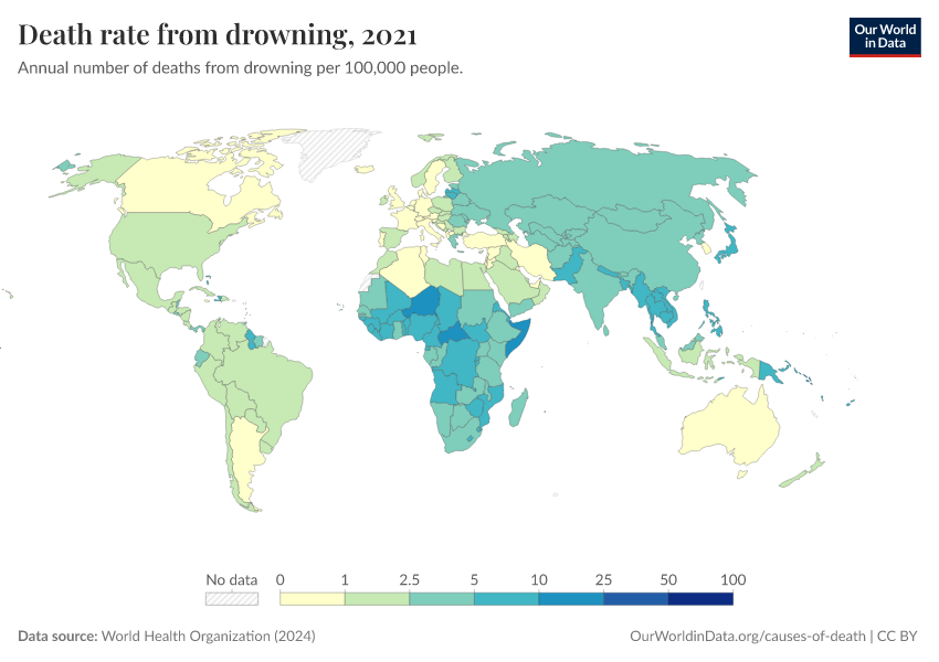 “Data Page: Death rate from drowning”, part of the following publication: Esteban Ortiz-Ospina and Max Roser (2016) - “Global Health”. Data adapted from World Health Organization. Retrieved from https://categorical-map-color.owid.pages.dev/grapher/death-rate-from-drowning-ghe [online resource]How to cite this data
