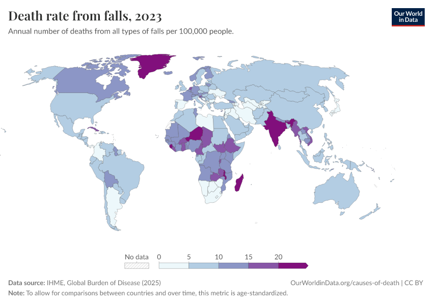 IHME, Global Burden of Disease (2025) – with major processing by Our World in Data. “Death rate from falls” [dataset]. IHME, Global Burden of Disease, “Global Burden of Disease - Deaths” [original data]. Retrieved February 24, 2026 from https://categorical-map-color.owid.pages.dev/grapher/death-rate-from-falls-gbd
