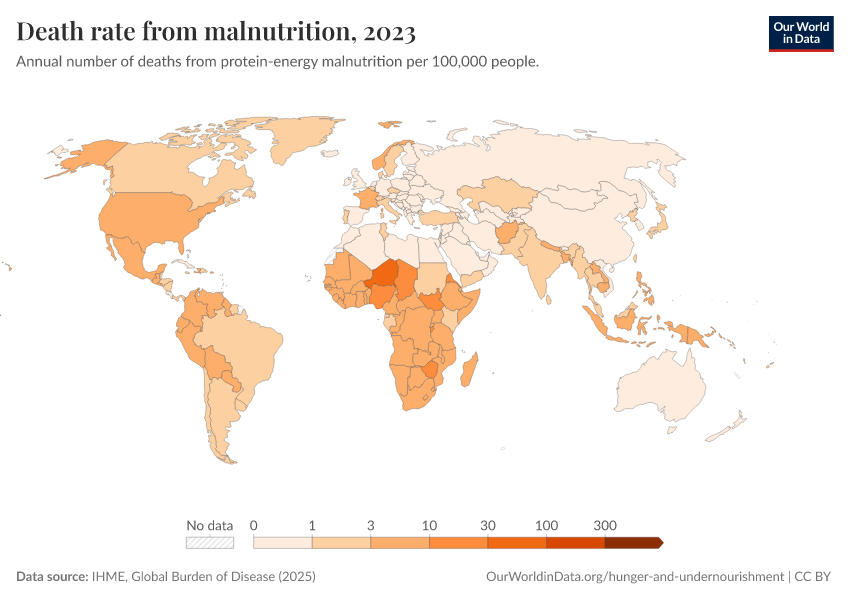 IHME, Global Burden of Disease (2025) – with major processing by Our World in Data. “Death rate from malnutrition” [dataset]. IHME, Global Burden of Disease, “Global Burden of Disease - Deaths” [original data]. Retrieved February 24, 2026 from https://categorical-map-color.owid.pages.dev/grapher/death-rate-from-malnutrition