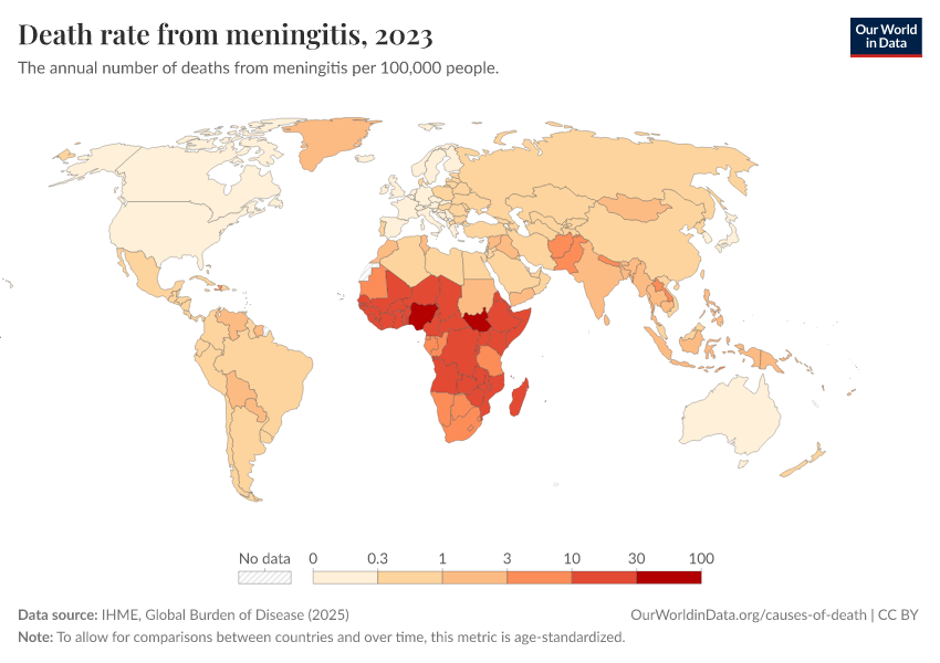 IHME, Global Burden of Disease (2025) – with major processing by Our World in Data. “Death rate from meningitis” [dataset]. IHME, Global Burden of Disease, “Global Burden of Disease - Deaths” [original data]. Retrieved February 24, 2026 from https://categorical-map-color.owid.pages.dev/grapher/death-rate-from-meningitis