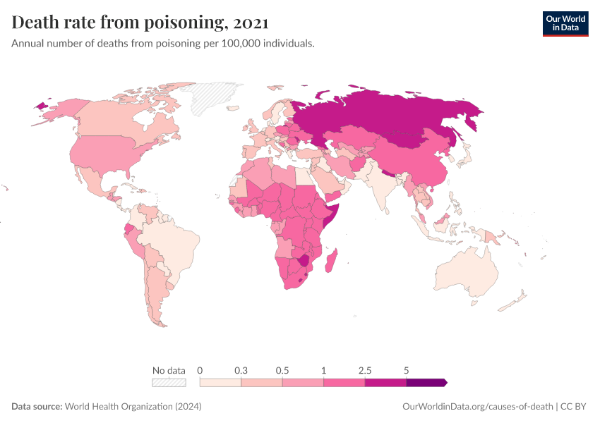 World Health Organization (2024) – with major processing by Our World in Data. “Death rate from poisoning” [dataset]. World Health Organization, “Global Health Estimates” [original data]. Retrieved February 24, 2026 from https://categorical-map-color.owid.pages.dev/grapher/death-rate-from-poisoning-ghe