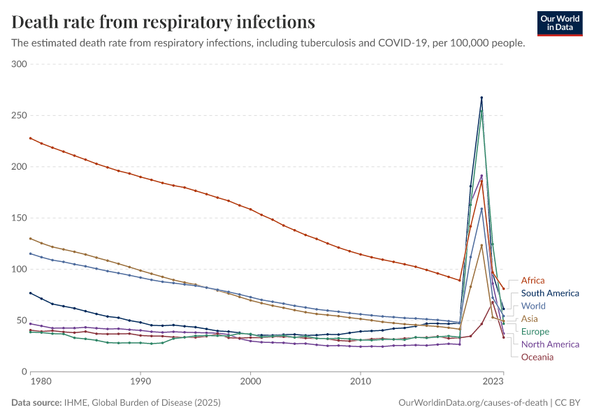 “Data Page: Death rate from respiratory infections”, part of the following publication: Esteban Ortiz-Ospina and Max Roser (2016) - “Global Health”. Data adapted from IHME, Global Burden of Disease. Retrieved from https://categorical-map-color.owid.pages.dev/grapher/death-rate-from-respiratory-infections-gbd [online resource]How to cite this data
