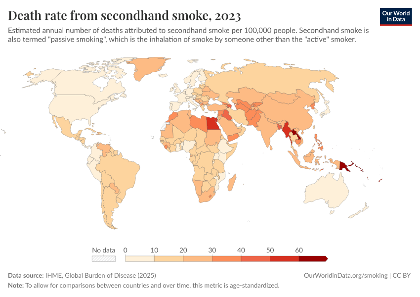 IHME, Global Burden of Disease (2025) – with major processing by Our World in Data. “Death rate from secondhand smoke” [dataset]. IHME, Global Burden of Disease, “Global Burden of Disease - Risk Factors - Deaths” [original data]. Retrieved February 24, 2026 from https://categorical-map-color.owid.pages.dev/grapher/death-rate-from-secondhand-smoke