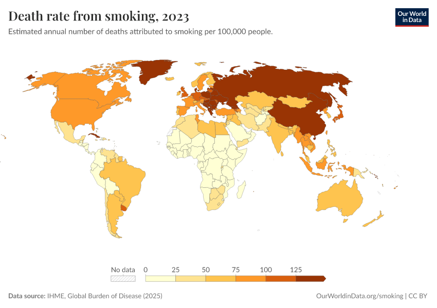 IHME, Global Burden of Disease (2025) – with major processing by Our World in Data. “Death rate from smoking” [dataset]. IHME, Global Burden of Disease, “Global Burden of Disease - Risk Factors - Deaths” [original data]. Retrieved February 24, 2026 from https://categorical-map-color.owid.pages.dev/grapher/death-rate-from-smoking