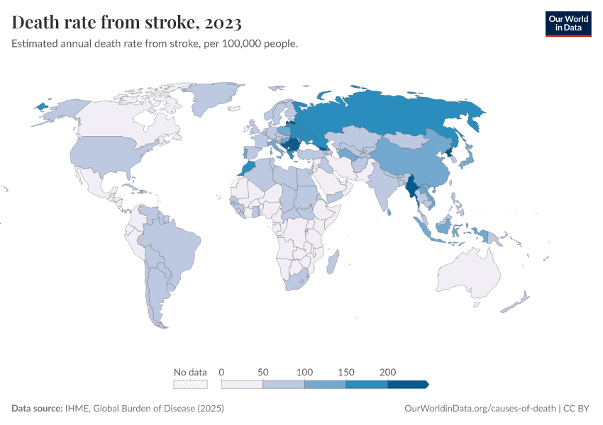 IHME, Global Burden of Disease (2025) – with major processing by Our World in Data. “Death rate from stroke” [dataset]. IHME, Global Burden of Disease, “Global Burden of Disease - Deaths” [original data]. Retrieved February 24, 2026 from https://categorical-map-color.owid.pages.dev/grapher/death-rate-from-strokes