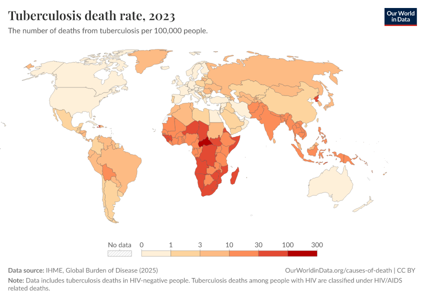 IHME, Global Burden of Disease (2025) – with major processing by Our World in Data. “Tuberculosis death rate” [dataset]. IHME, Global Burden of Disease, “Global Burden of Disease - Deaths” [original data]. Retrieved February 24, 2026 from https://categorical-map-color.owid.pages.dev/grapher/death-rate-from-tuberculosis-gbd