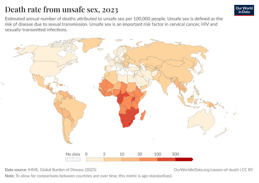 IHME, Global Burden of Disease (2025) – with major processing by Our World in Data. “Death rate from unsafe sex” [dataset]. IHME, Global Burden of Disease, “Global Burden of Disease - Risk Factors - Deaths” [original data]. Retrieved February 24, 2026 from https://categorical-map-color.owid.pages.dev/grapher/death-rates-from-unsafe-sex