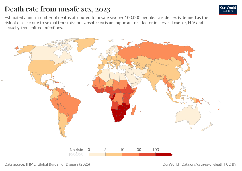 IHME, Global Burden of Disease (2025) – with major processing by Our World in Data. “Death rate from unsafe sex” [dataset]. IHME, Global Burden of Disease, “Global Burden of Disease - Risk Factors - Deaths” [original data]. Retrieved February 24, 2026 from https://categorical-map-color.owid.pages.dev/grapher/death-rates-from-unsafe-sex-gbd