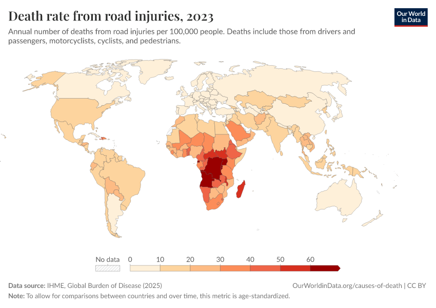 IHME, Global Burden of Disease (2025) – with major processing by Our World in Data. “Death rate from road injuries” [dataset]. IHME, Global Burden of Disease, “Global Burden of Disease - Deaths” [original data]. Retrieved February 24, 2026 from https://categorical-map-color.owid.pages.dev/grapher/death-rates-road-incidents