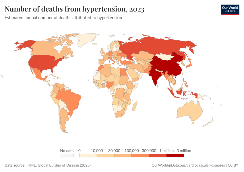 “Data Page: Number of deaths from hypertension”, part of the following publication: Esteban Ortiz-Ospina and Max Roser (2016) - “Global Health”. Data adapted from IHME, Global Burden of Disease. Retrieved from https://categorical-map-color.owid.pages.dev/grapher/deaths-due-to-high-blood-pressure [online resource]How to cite this data