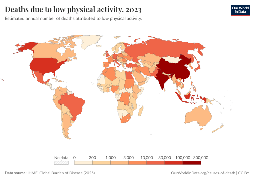 “Data Page: Deaths due to low physical activity”, part of the following publication: Esteban Ortiz-Ospina and Max Roser (2016) - “Global Health”. Data adapted from IHME, Global Burden of Disease. Retrieved from https://categorical-map-color.owid.pages.dev/grapher/deaths-due-to-low-physical-activity [online resource]How to cite this data