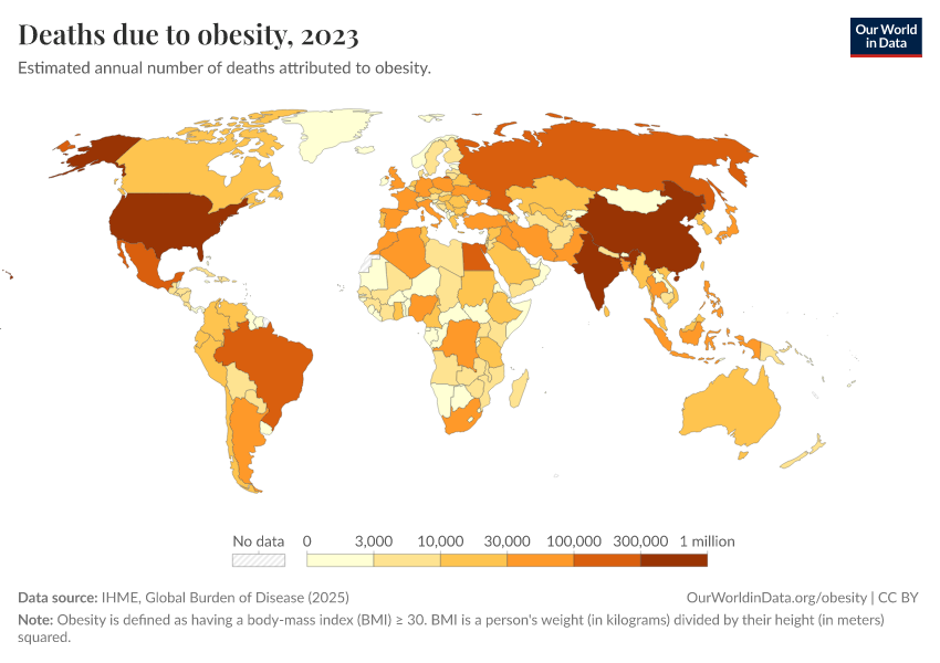 IHME, Global Burden of Disease (2025) – with major processing by Our World in Data. “Deaths due to obesity” [dataset]. IHME, Global Burden of Disease, “Global Burden of Disease - Risk Factors - Deaths” [original data]. Retrieved February 24, 2026 from https://categorical-map-color.owid.pages.dev/grapher/deaths-due-to-obesity