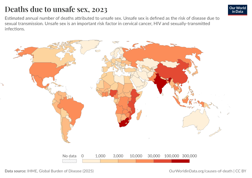 “Data Page: Deaths due to unsafe sex”, part of the following publication: Esteban Ortiz-Ospina and Max Roser (2016) - “Global Health”. Data adapted from IHME, Global Burden of Disease. Retrieved from https://categorical-map-color.owid.pages.dev/grapher/deaths-due-to-unsafe-sex [online resource]How to cite this data