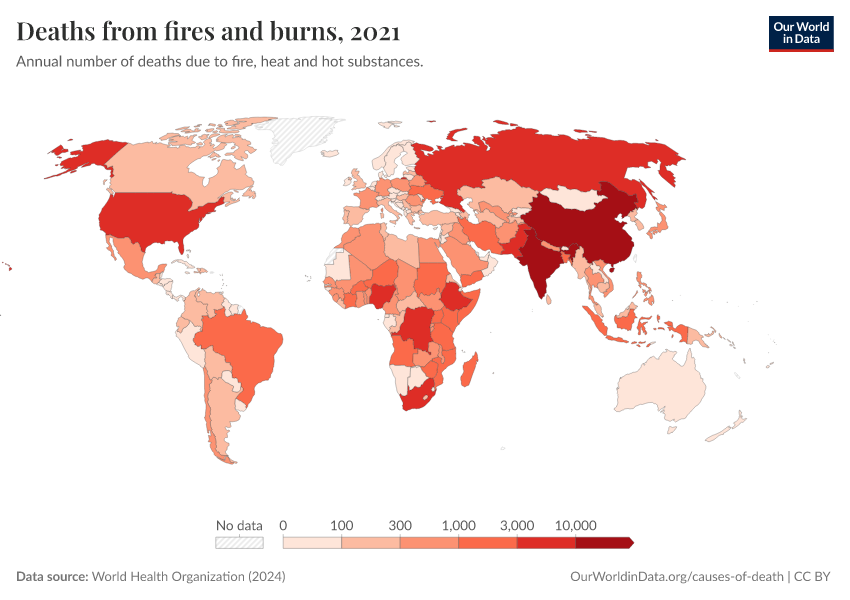 “Data Page: Deaths from fires and burns”, part of the following publication: Esteban Ortiz-Ospina and Max Roser (2016) - “Global Health”. Data adapted from World Health Organization. Retrieved from https://categorical-map-color.owid.pages.dev/grapher/deaths-from-fires-and-burns-who [online resource]How to cite this data