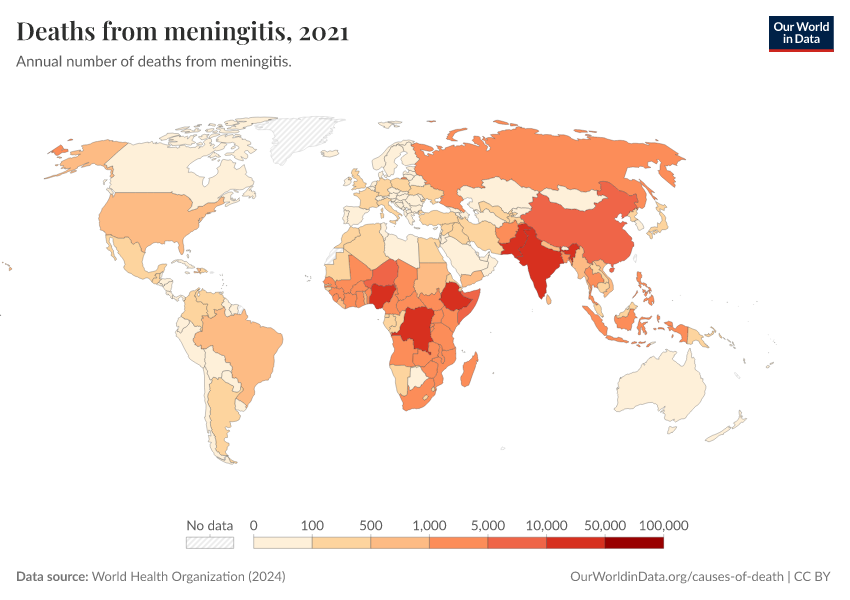 “Data Page: Deaths from meningitis”, part of the following publication: Esteban Ortiz-Ospina and Max Roser (2016) - “Global Health”. Data adapted from World Health Organization. Retrieved from https://categorical-map-color.owid.pages.dev/grapher/deaths-from-meningitis-ghe [online resource]How to cite this data