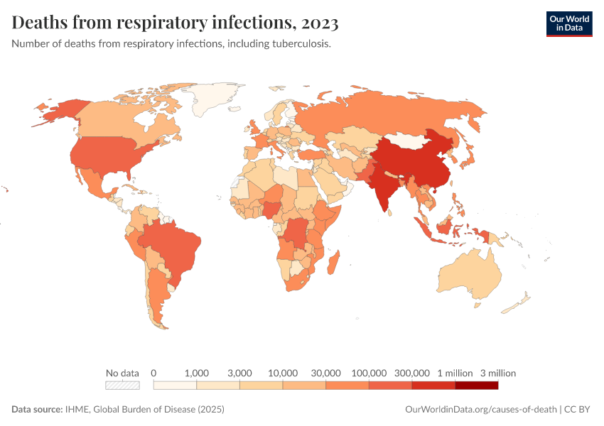 IHME, Global Burden of Disease (2025) – with major processing by Our World in Data. “Deaths from respiratory infections” [dataset]. IHME, Global Burden of Disease, “Global Burden of Disease - Deaths” [original data]. Retrieved February 24, 2026 from https://categorical-map-color.owid.pages.dev/grapher/deaths-from-respiratory-infections