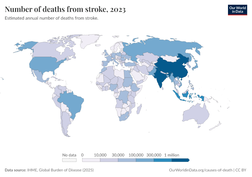 IHME, Global Burden of Disease (2025) – with major processing by Our World in Data. “Number of deaths from stroke” [dataset]. IHME, Global Burden of Disease, “Global Burden of Disease - Deaths” [original data]. Retrieved February 24, 2026 from https://categorical-map-color.owid.pages.dev/grapher/deaths-from-strokes